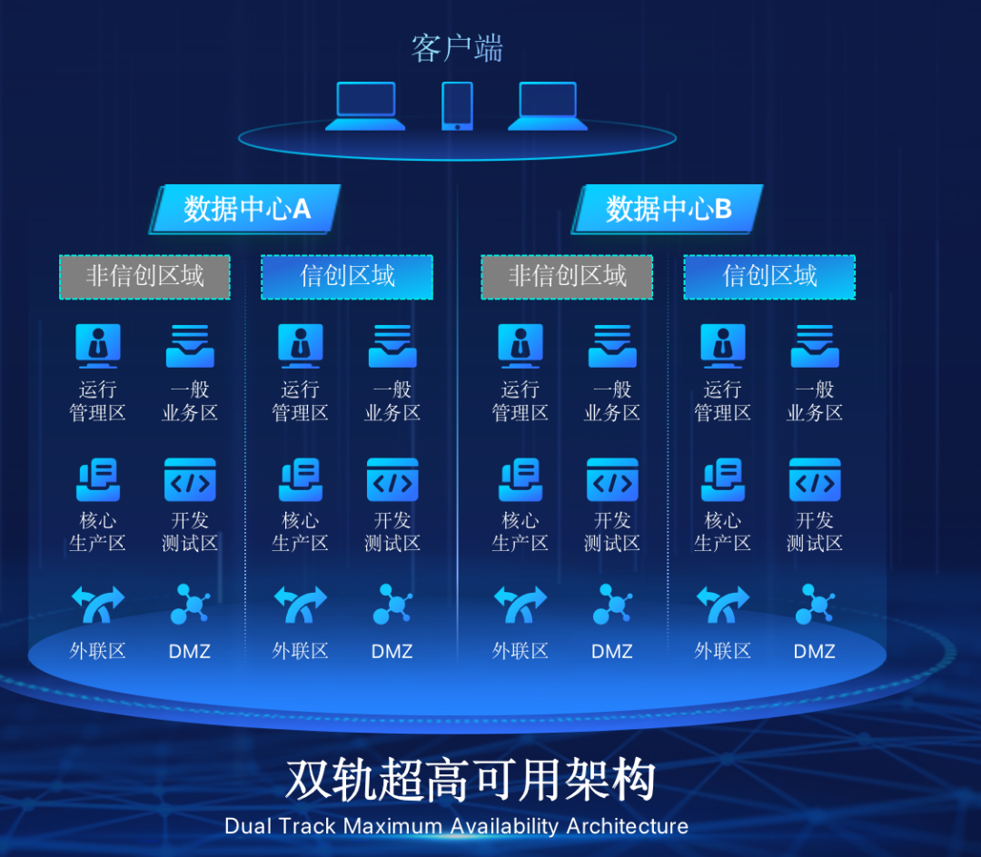 ballbet贝博在企业面临自主创新IT基础重构过程中,推出的全新架构双轨超高可用架构(简称DTMAA),在双活数据中心的分区调度基础上,添加每个数据中心内信创域和非信创域的分域调度,来实现分区分域协同的多活双轨超高可用。